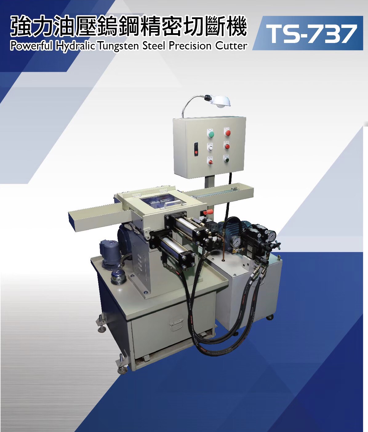 TS-737強力油壓鎢鋼精密切斷機,專門針對最難切的鎢鋼材質研發,配合鑽石砂輪片,成了鎢鋼圓棒、板材、頂針、刀具業必備利器,客戶遍及全台、東南亞及中國。