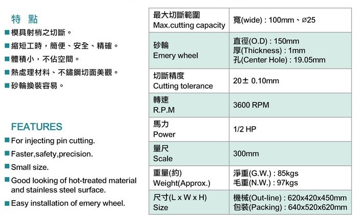 TS-730高速精密切斷機,具簡便、安全、不占空間,是各行各業工廠的必備機型,金屬、塑膠等常見材質皆能輕易切斷,不易損壞,維修簡單,常見客戶機台使用十餘年的財崧機器依然好用。